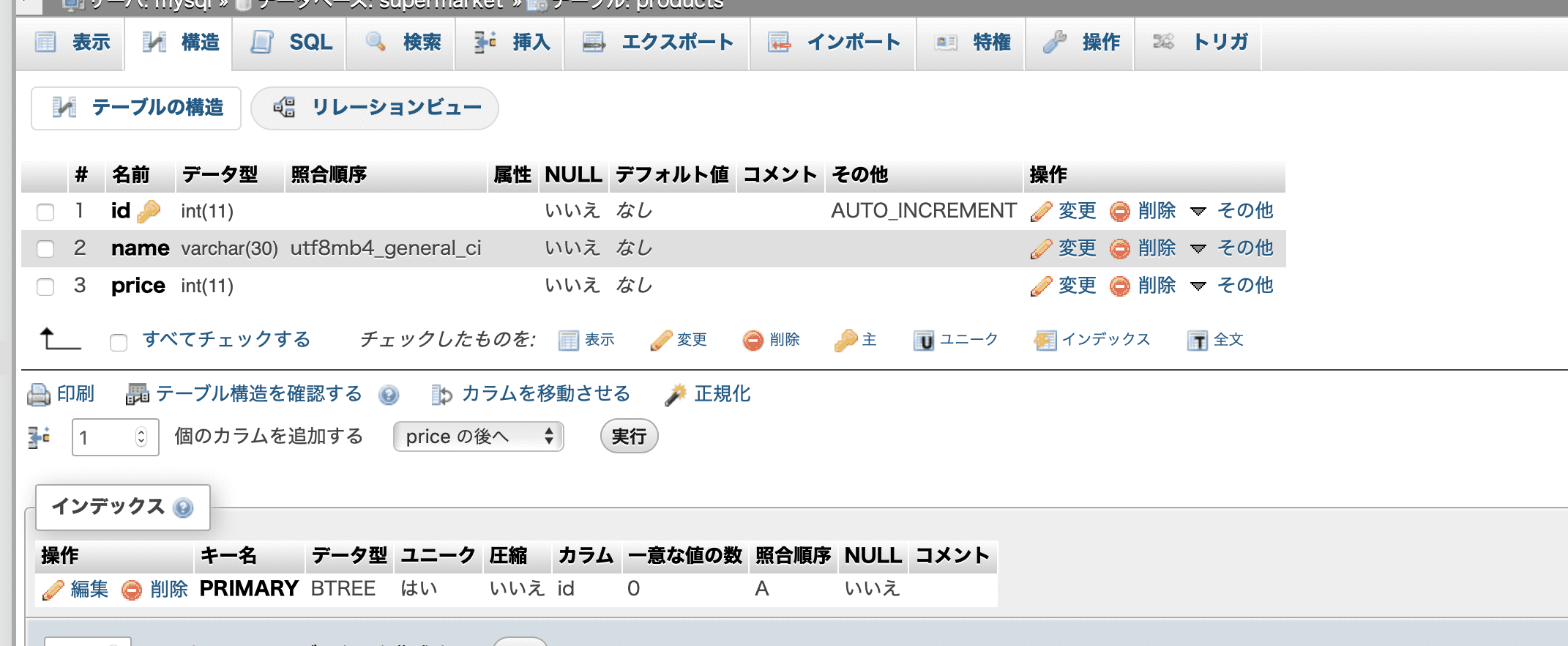 続いて、データベース「supermarket」に対してテーブルを作成しましょう。