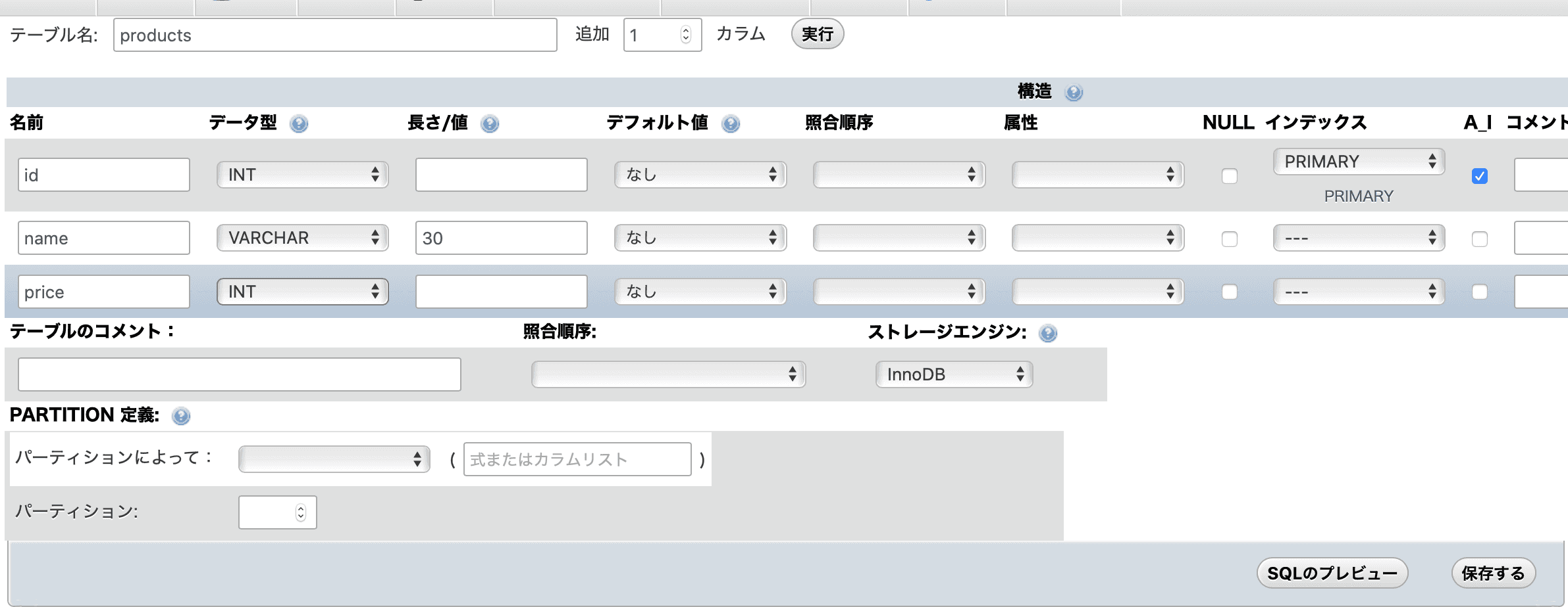 3つのカラム(=列)を持つテーブル「products」を作成しましょう。